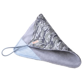 | [1] .ゴムひもが左上、クリーニングクロス部が右下になるようラップクッションを広げ、中央にカメラを、レンズがクロス部に向くようにして置きます。 | [2] 右上の端をカメラにかぶせます。 | |